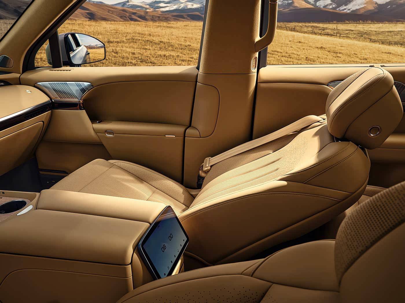 至于二排,则配备了两个独立座椅,而且还有腿托。其它具体配置方面,还有二排右侧配备零重力座椅、左侧飞航舒享座椅、二排座椅电动扶手、二排座椅16点按摩/16向电动调节(最多)/3挡通风/加热/腿托加热等,再加上可翻转娱乐屏,左侧小桌板、右侧磁吸拓展坞,可以说二排的配置直接拉满了。