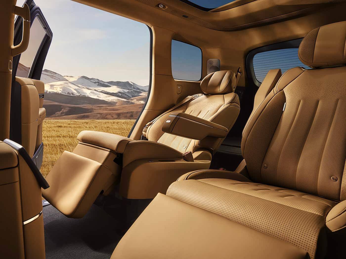 先看前排,新车提供有提供16点座椅按摩、16向电动调节、3挡通风/加热/腿托加热、将提供女王副驾零重力座椅(Nappa真皮、一键零重力舒躺)、座椅集成式安全带以及座垫气囊。