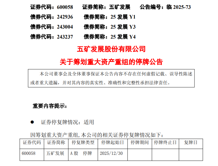 “本次交易预计构成重大资产重组及关联交易,同时不构成实际控制人变更,不构成重组上市。”五矿发展方面表示。