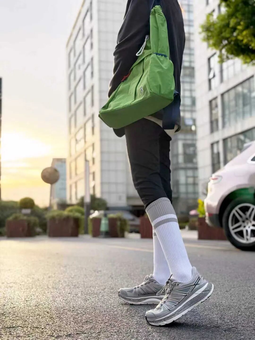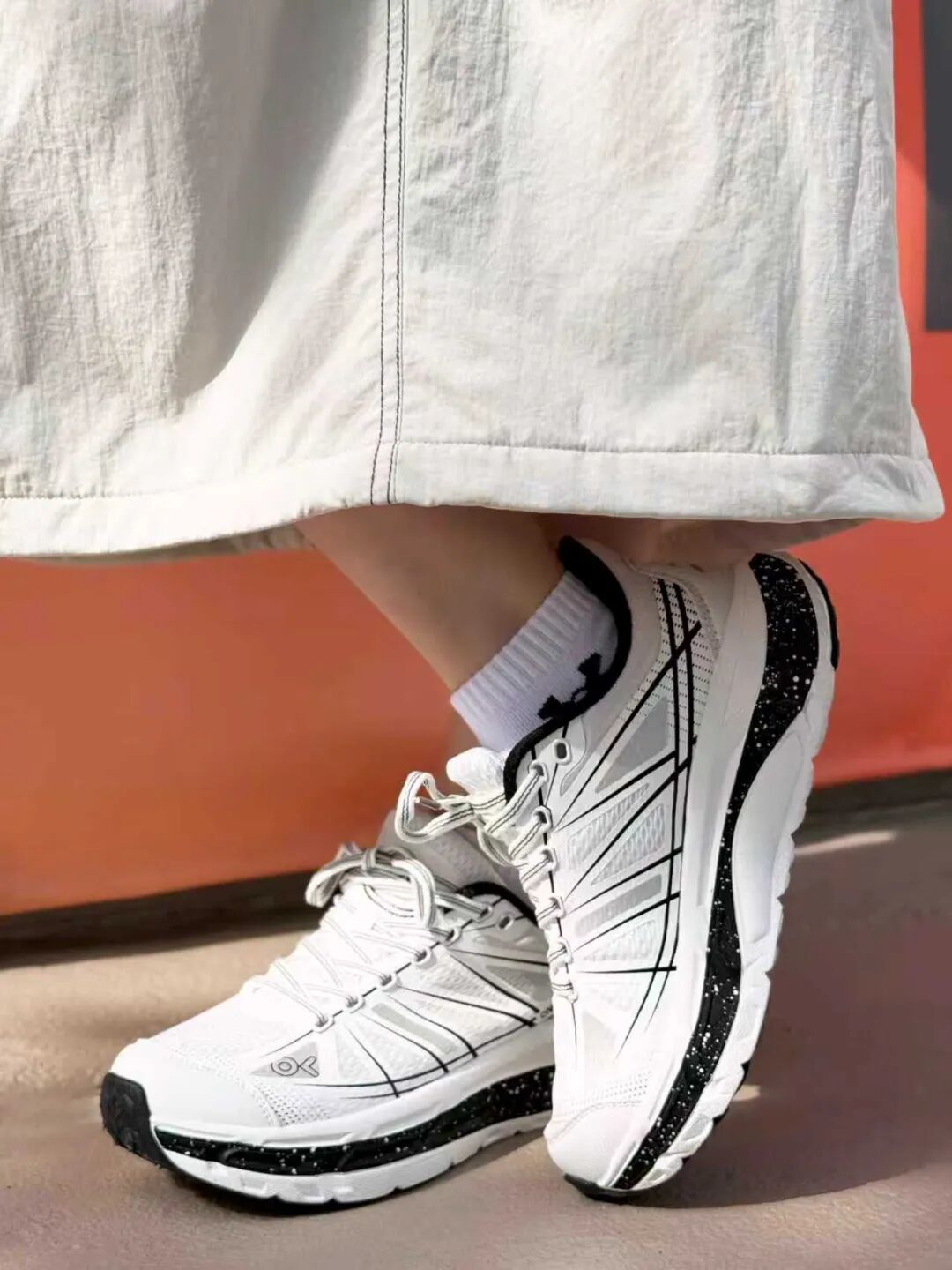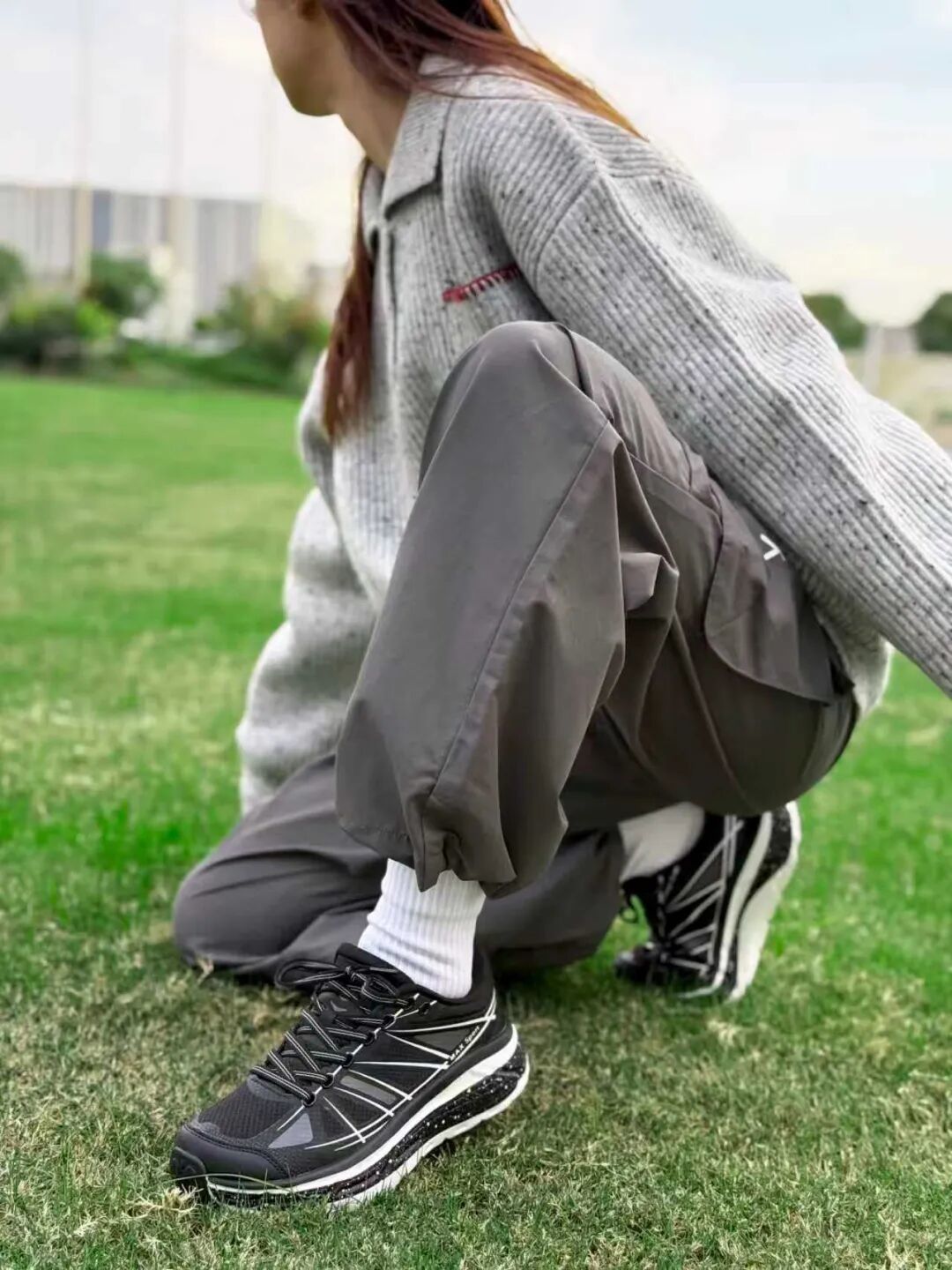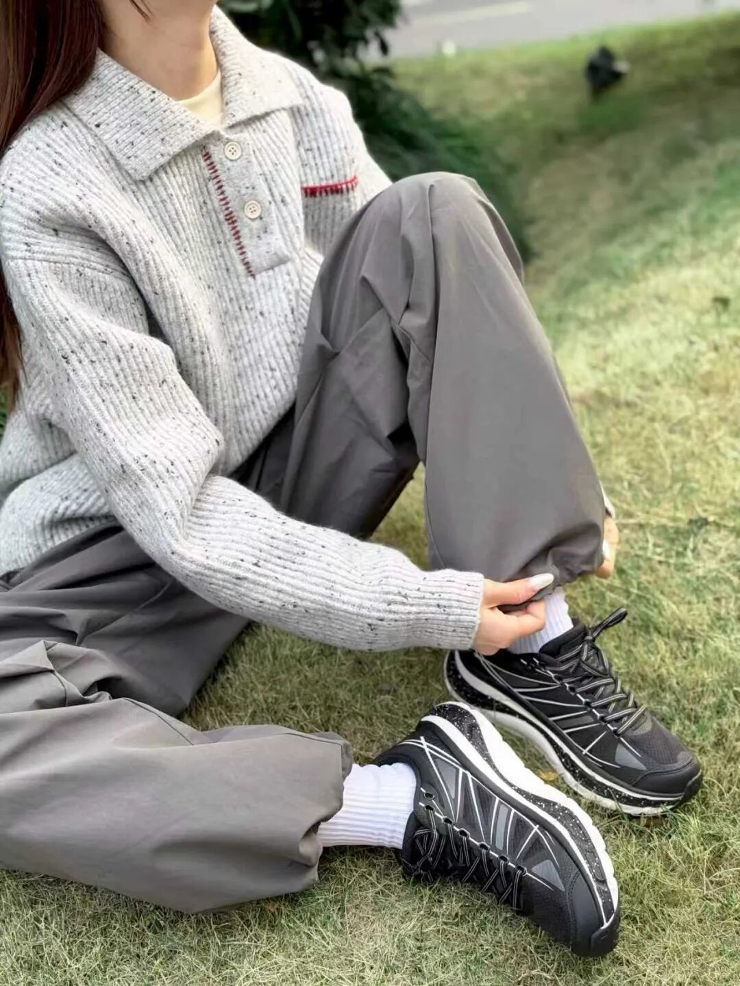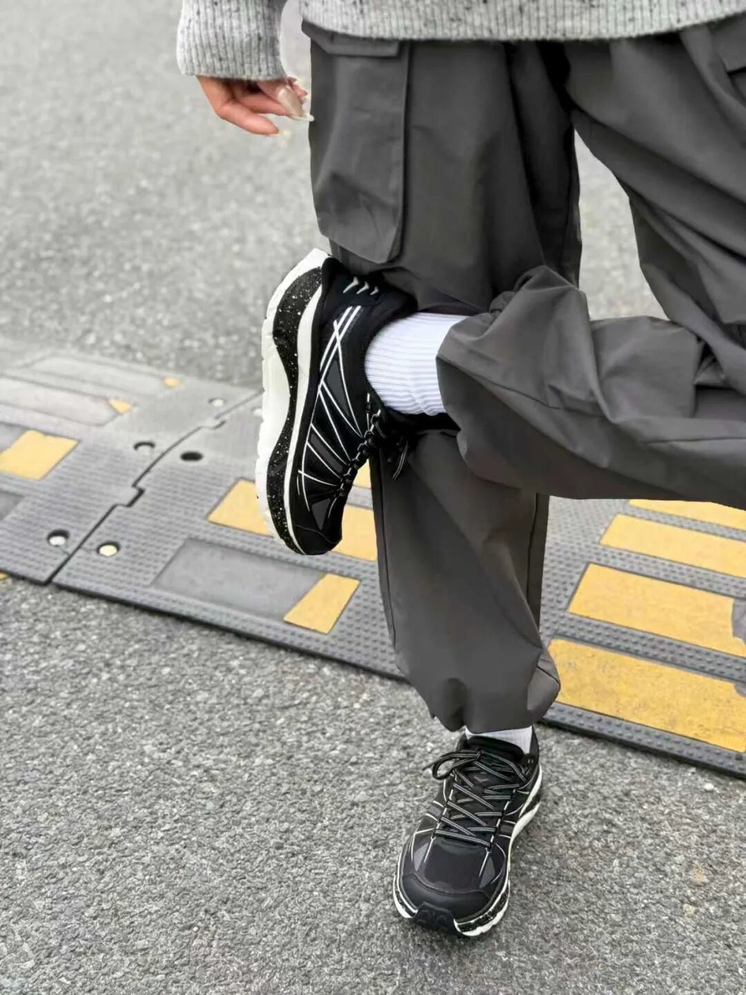 大衣配运动裤总像凑活?换双透气的跑鞋——时尚感鞋面搭深灰卫裤,露出的鞋边线条利落,运动休闲,都能穿出品格感。