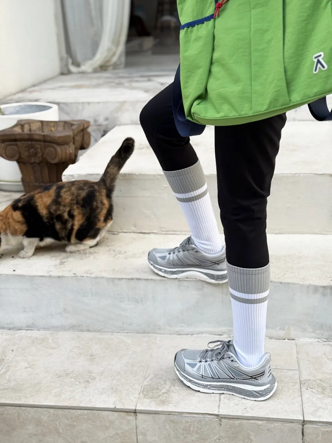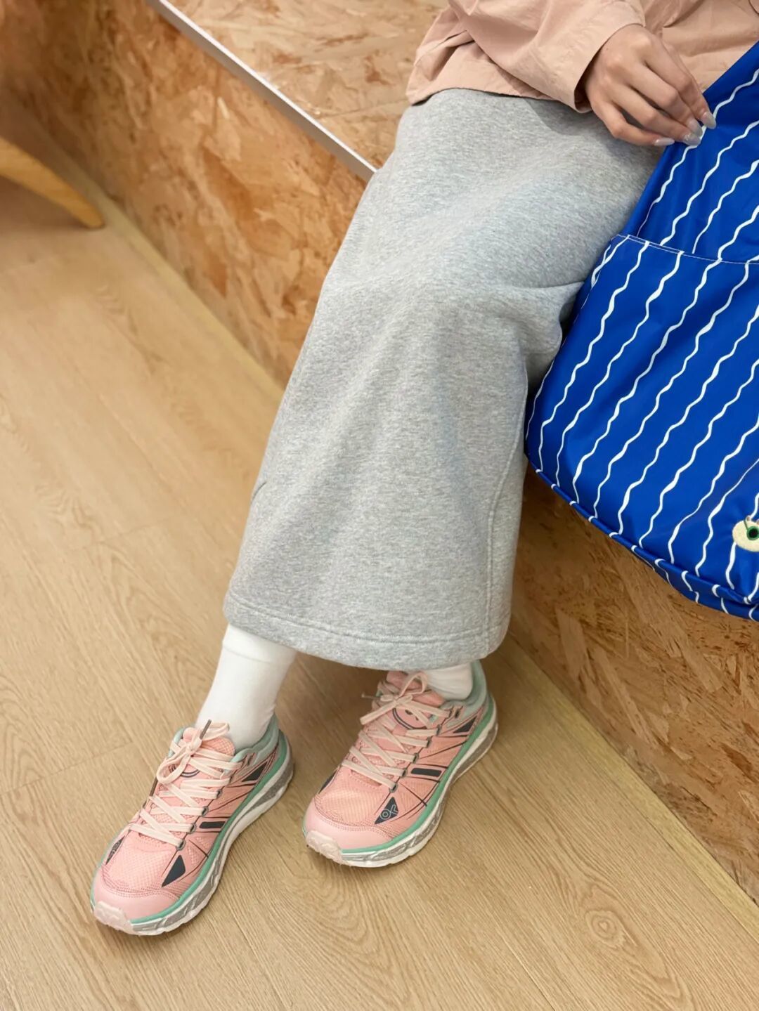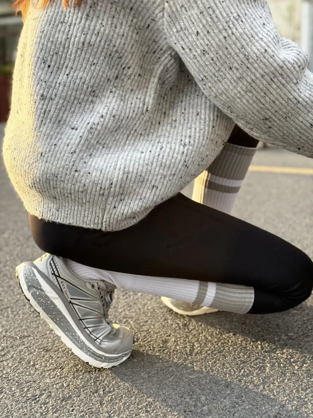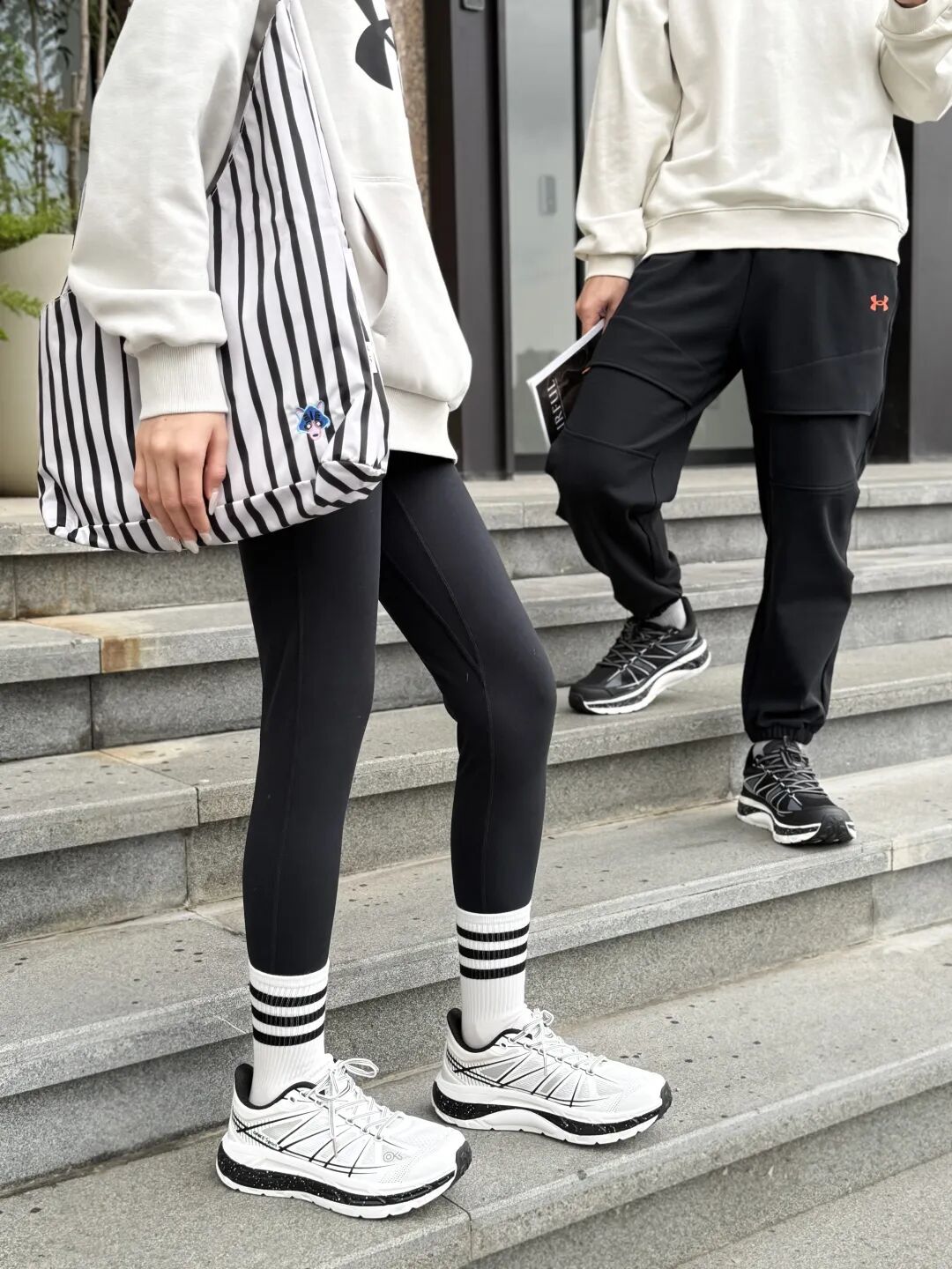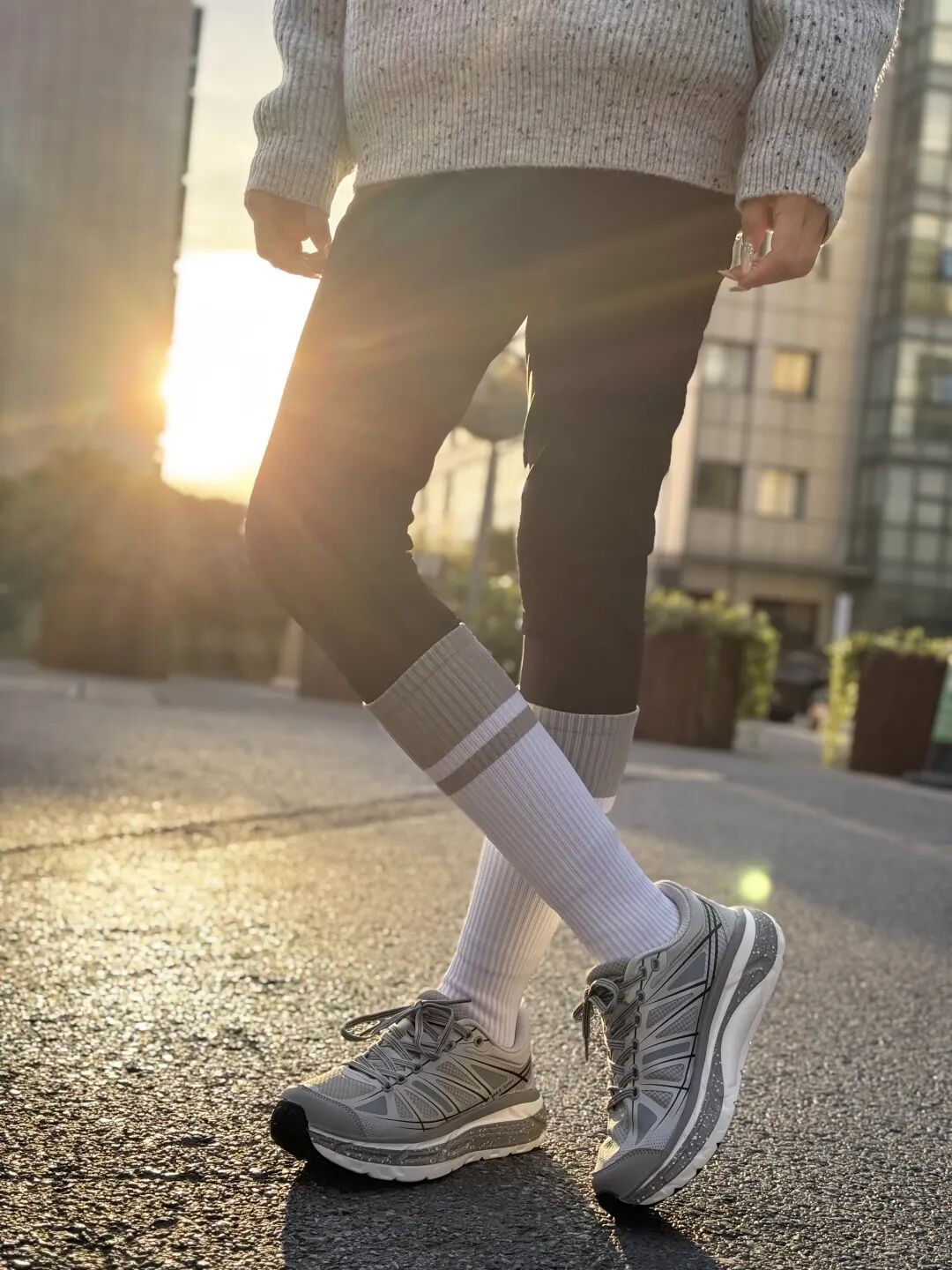 大衣配运动裤总像凑活?换双透气的跑鞋——时尚感鞋面搭深灰卫裤,露出的鞋边线条利落,运动休闲,都能穿出品格感。