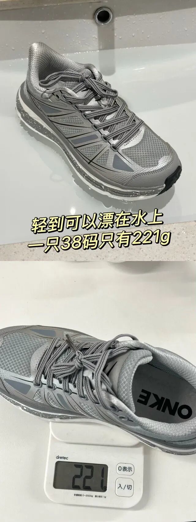 上脚特轻,轻到一只38码只有221g,可以漂在水上